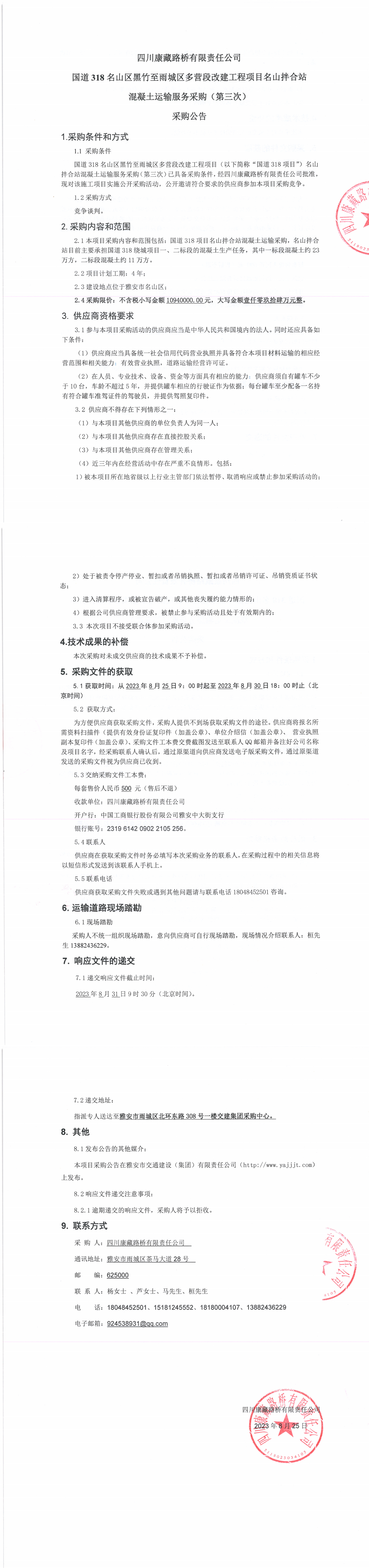 四川康藏路橋有限責(zé)任公司國道318名山區(qū)黑竹至雨城區(qū)多營段改建工程項目名山拌合站混凝土運輸服務(wù)采購(第三次)采購公告