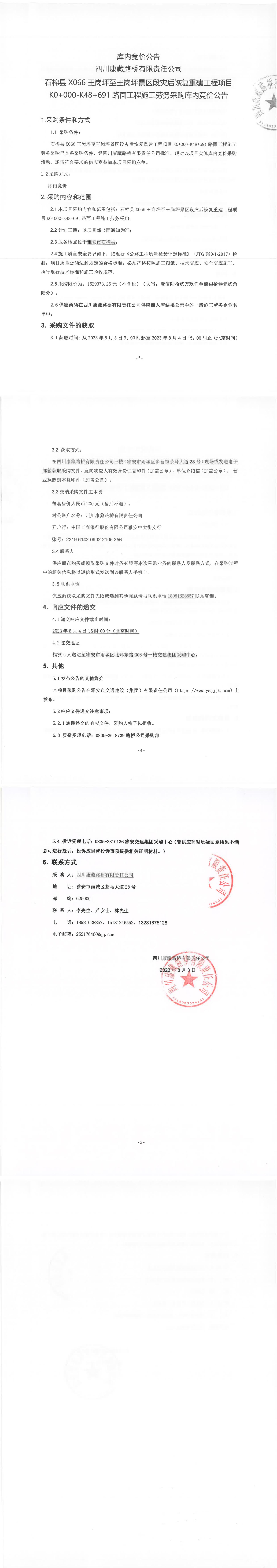 四川康藏路橋有限責(zé)任公司石棉縣X066王崗坪至王崗坪景區(qū)段災(zāi)后恢復(fù)重建工程項目K0+000-K48+691路面工程施工勞務(wù)采購庫內(nèi)競價公告