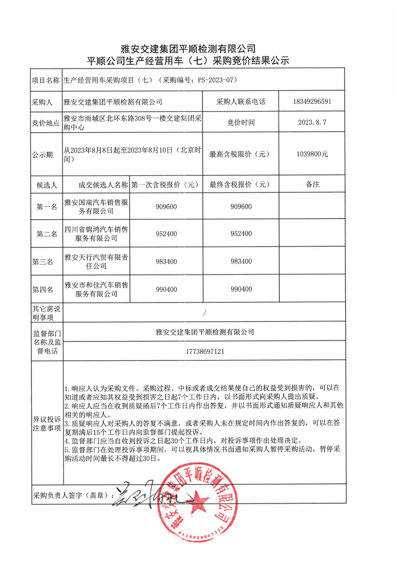 雅安交建集團(tuán)平順檢測(cè)有限公司平順公司生產(chǎn)經(jīng)營(yíng)用車(七)采購競(jìng)價(jià)結(jié)果公示