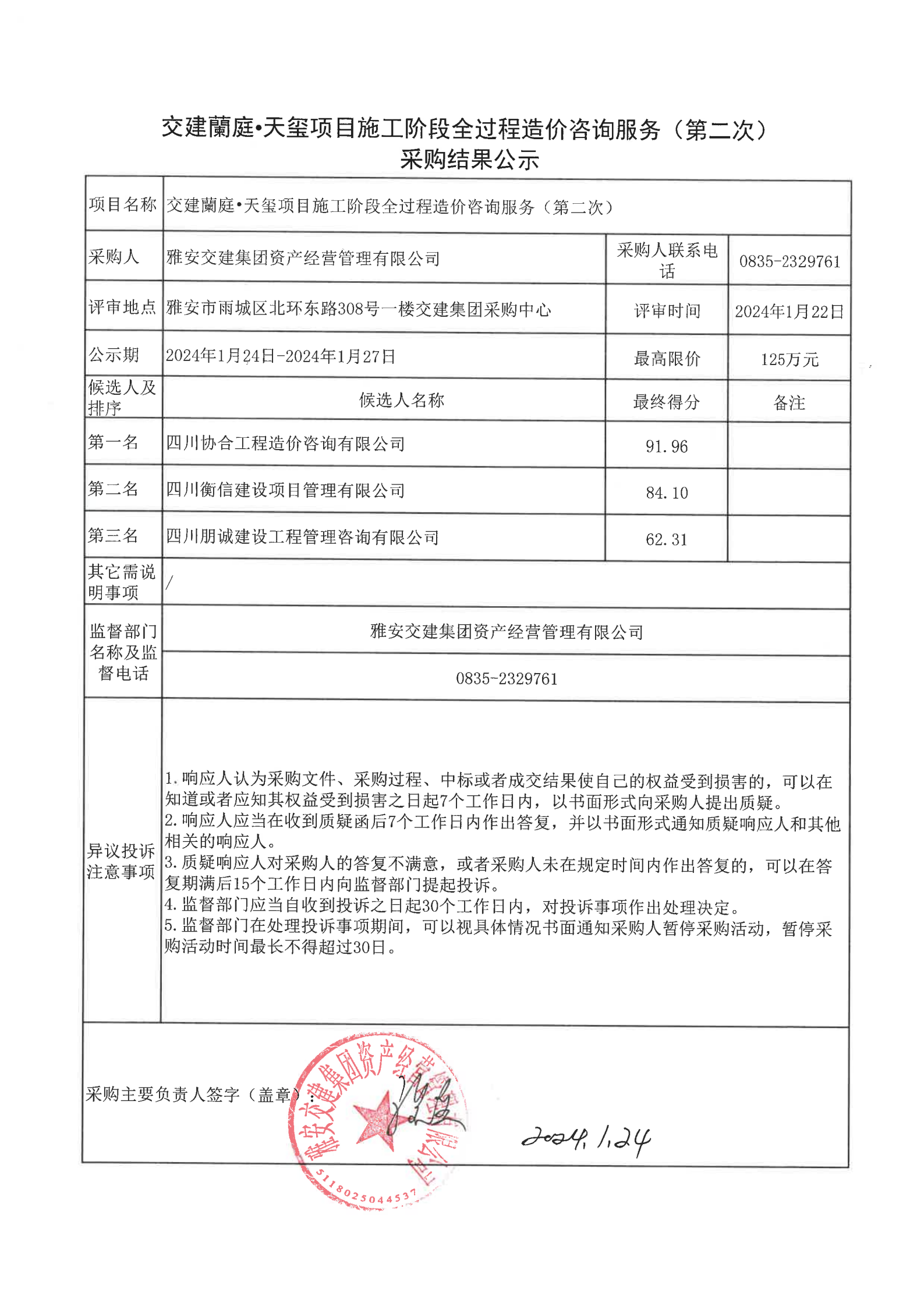 雅安交建集團資產(chǎn)經(jīng)營管理有限公司交建蘭庭·天璽項目施工階段全過程造價咨詢服務(wù)(第二次)采購結(jié)果公示