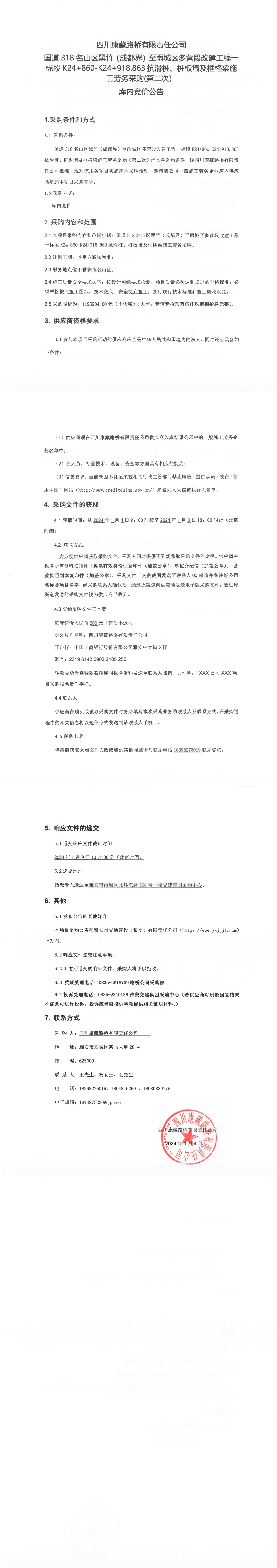 四川康藏路橋有限責任公司國道318名山區(qū)黑竹(成都界)至雨城區(qū)多營段改建工程一標段K24+860-K24+918.863抗滑樁、樁板墻及框格梁施工勞務(wù)采購(第二次)庫內(nèi)競價公告