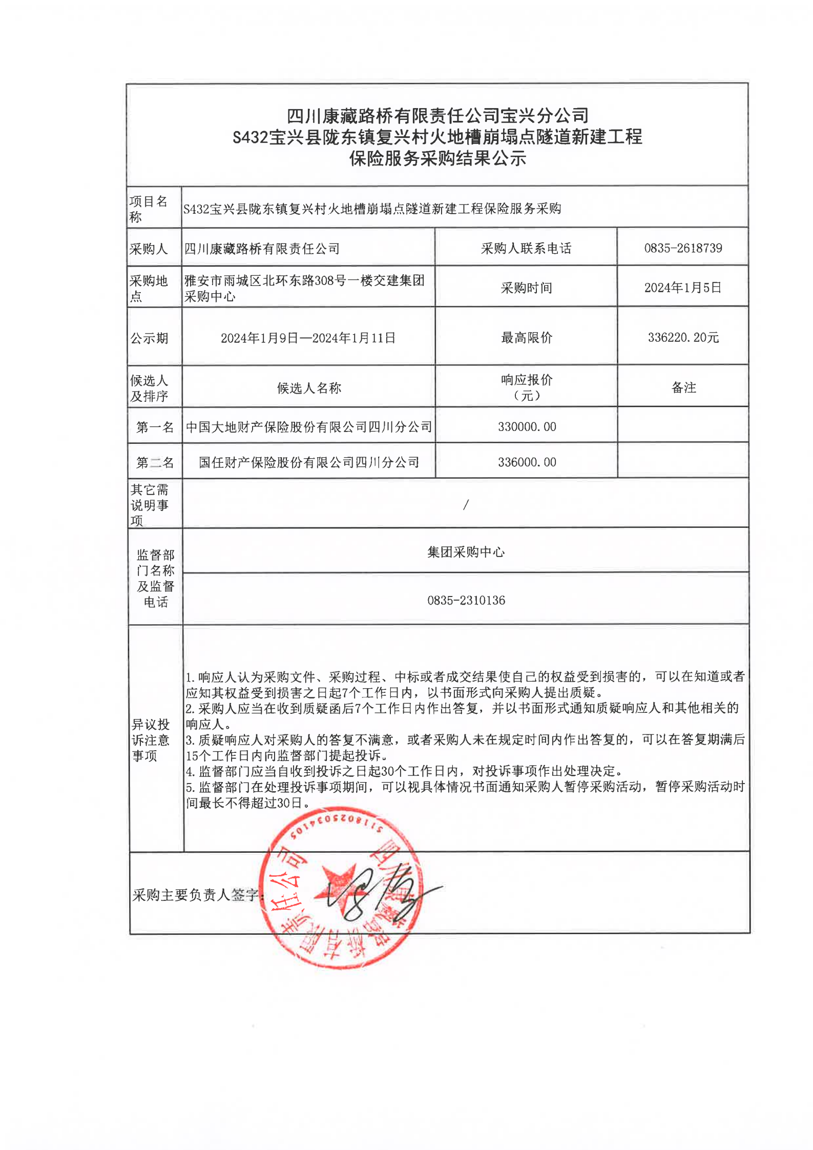 四川康藏路橋有限責(zé)任公司S432寶興縣隴東鎮(zhèn)復(fù)興村火地槽崩塌點隧道新建工程保險服務(wù)采購結(jié)果公示