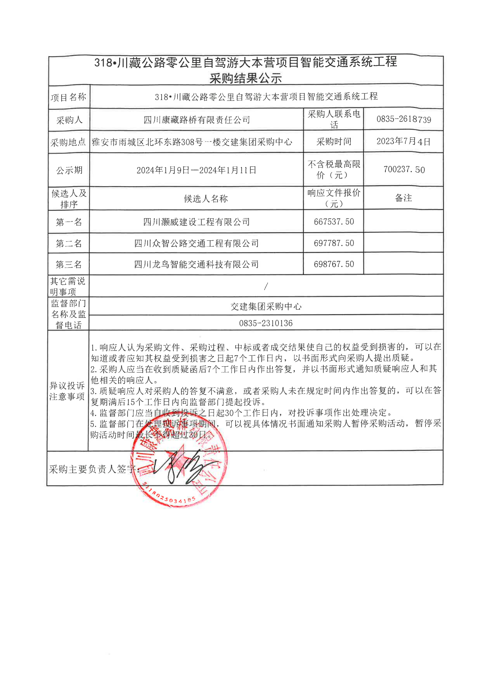 四川康藏路橋有限責(zé)任公司318·川藏公路零公里自駕游大本營項(xiàng)目智能交通系統(tǒng)工程采購結(jié)果公示