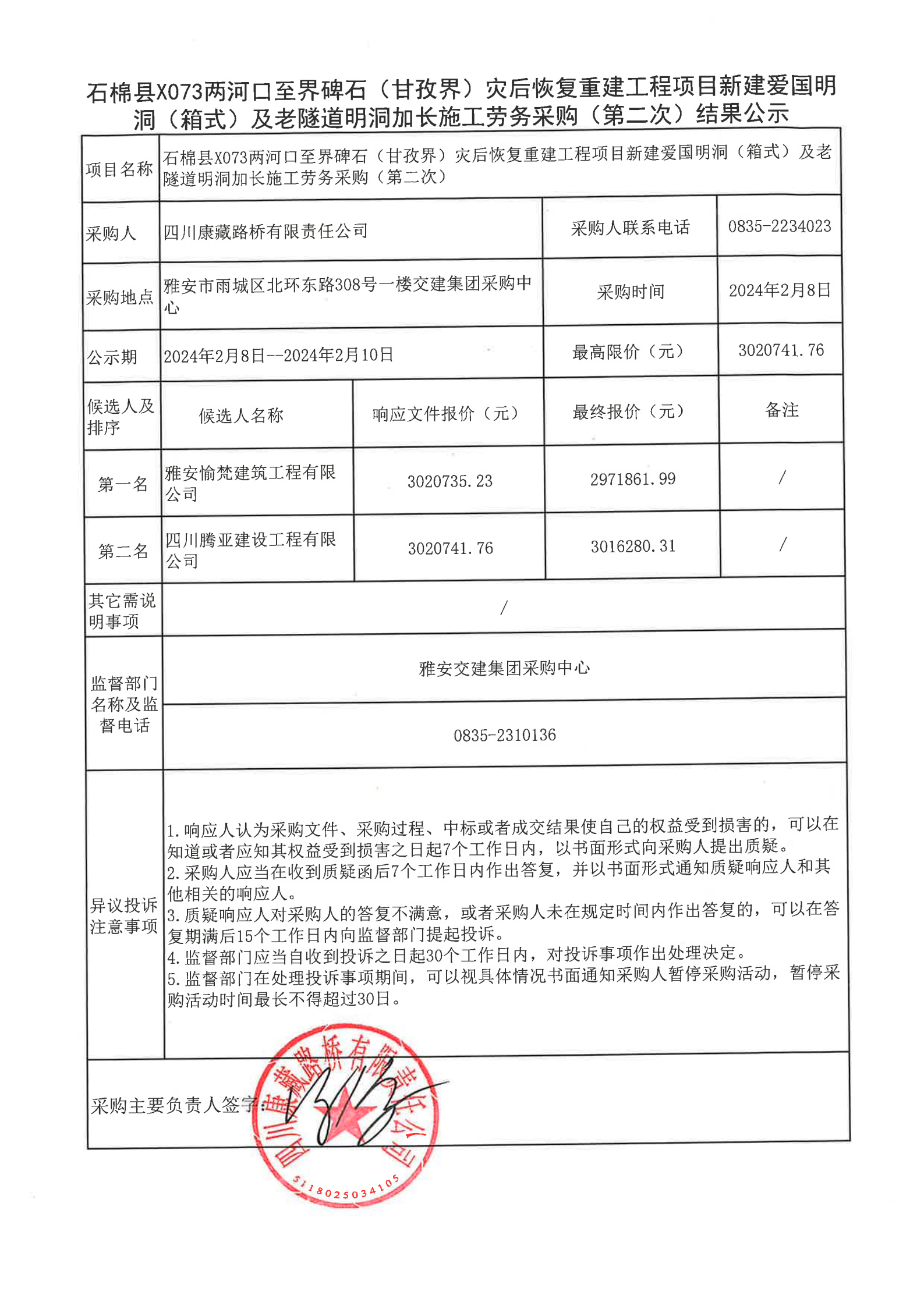 四川康藏路橋有限責(zé)任公司石棉縣X073兩河口至界碑石(甘孜界)災(zāi)后恢復(fù)重建工程項(xiàng)目新建愛(ài)國(guó)明洞(箱式)及老隧道明洞加長(zhǎng)施工勞務(wù)采購(gòu)(第二次)結(jié)果公示