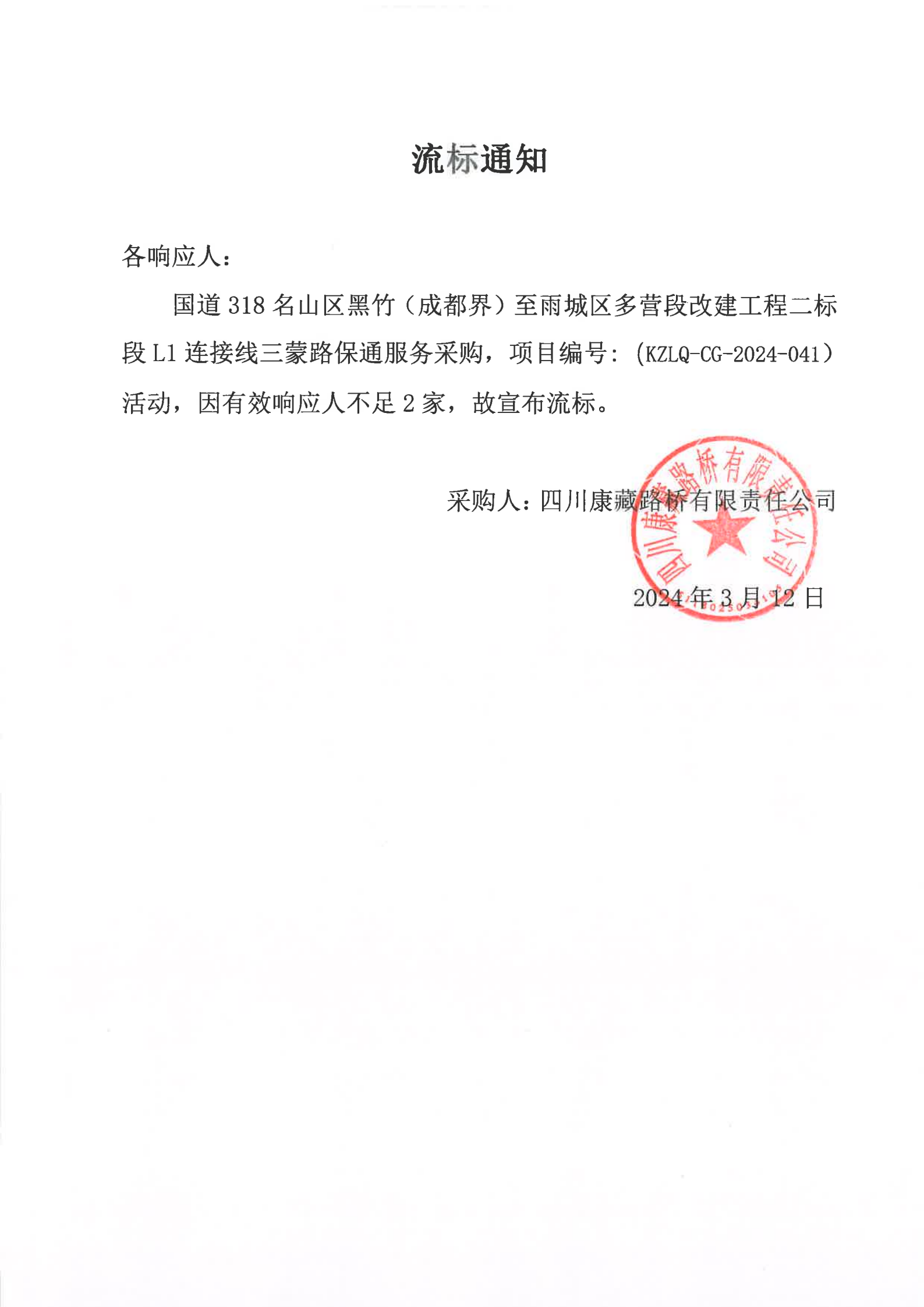 四川康藏路橋有限責(zé)任公司國(guó)道318名山區(qū)黑竹(成都界)至雨城區(qū)多營(yíng)段改建工程二標(biāo)段L1連接線三蒙路保通服務(wù)采購(gòu)流標(biāo)通知