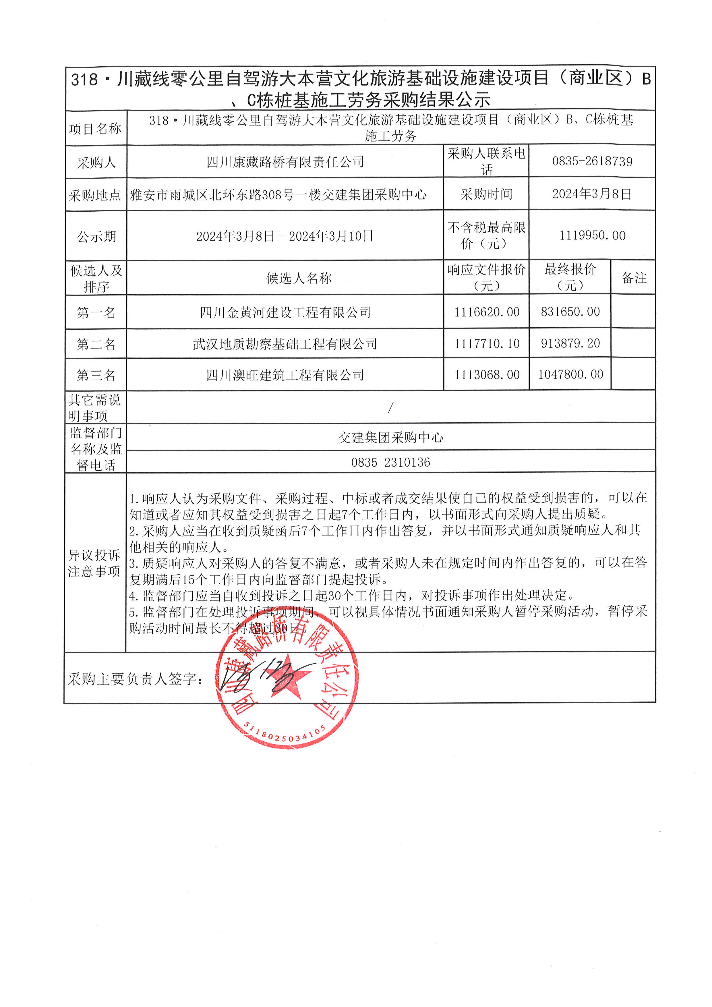 四川康藏路橋有限責(zé)任公司318·川藏線(xiàn)零公里自駕游大本營(yíng)文化旅游基礎(chǔ)設(shè)施建設(shè)項(xiàng)目(商業(yè)區(qū))B、C棟樁基施工勞務(wù)結(jié)果公示