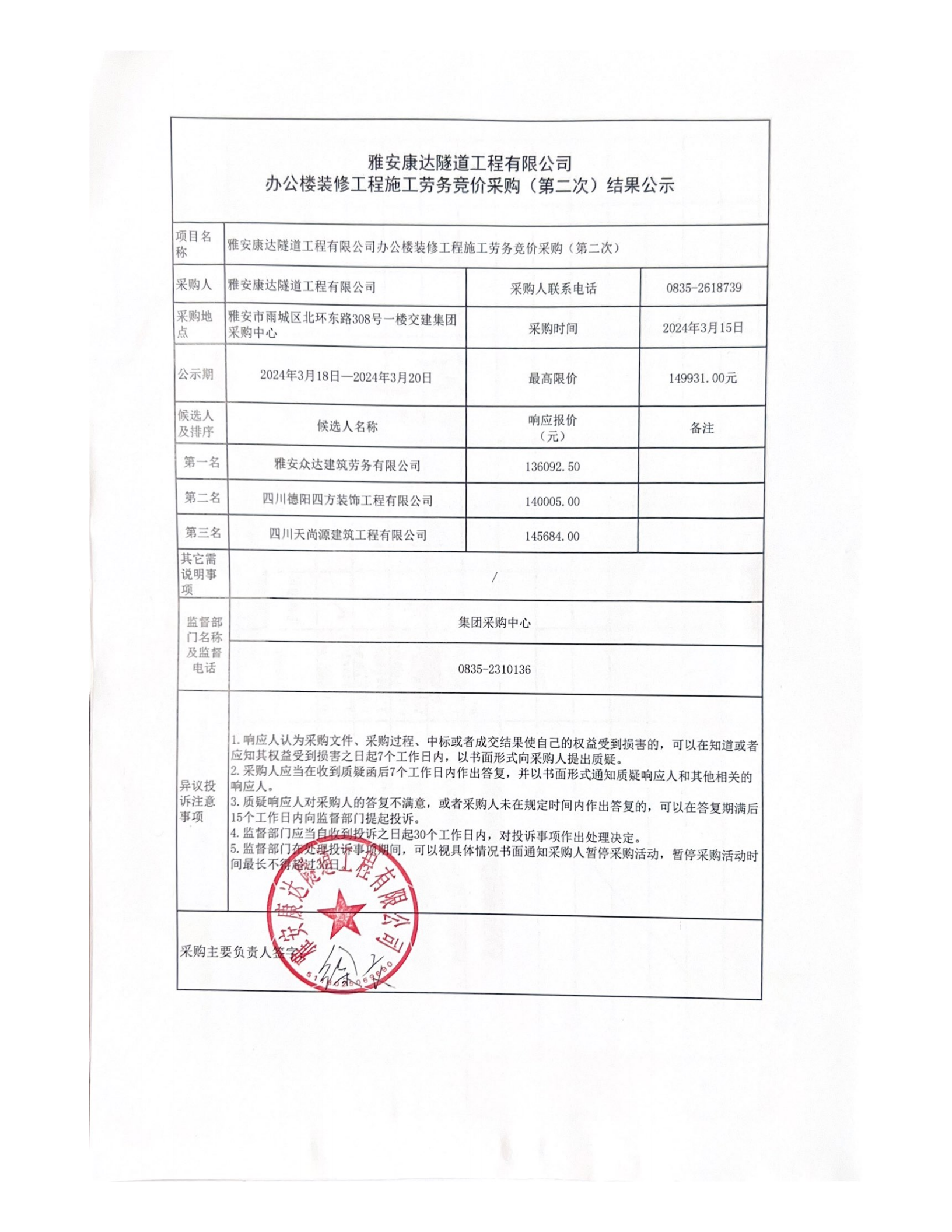雅安康達(dá)隧道工程有限公司辦公樓裝修工程施工勞務(wù)競價采購(第二次)結(jié)果公示