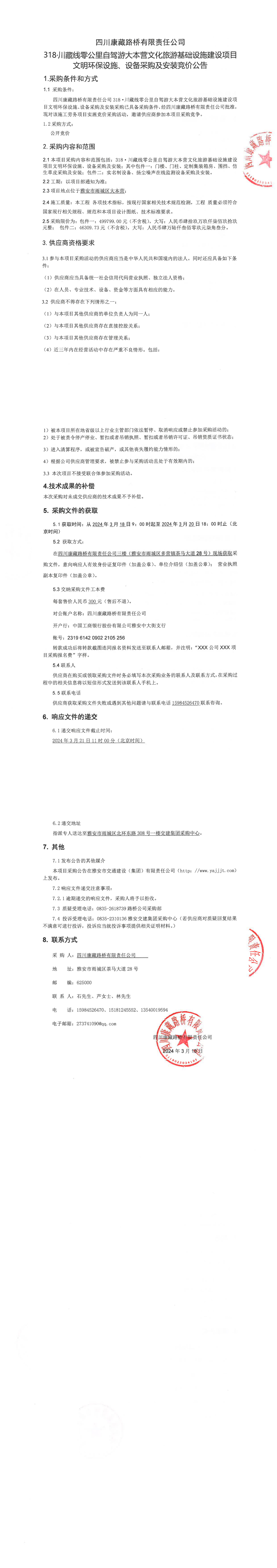 四川康藏路橋有限責(zé)任公司318·川藏公路零公里自駕游大本營文化旅游基礎(chǔ)設(shè)施建設(shè)項(xiàng)目文明環(huán)保設(shè)施、設(shè)備采購及安裝競價公告