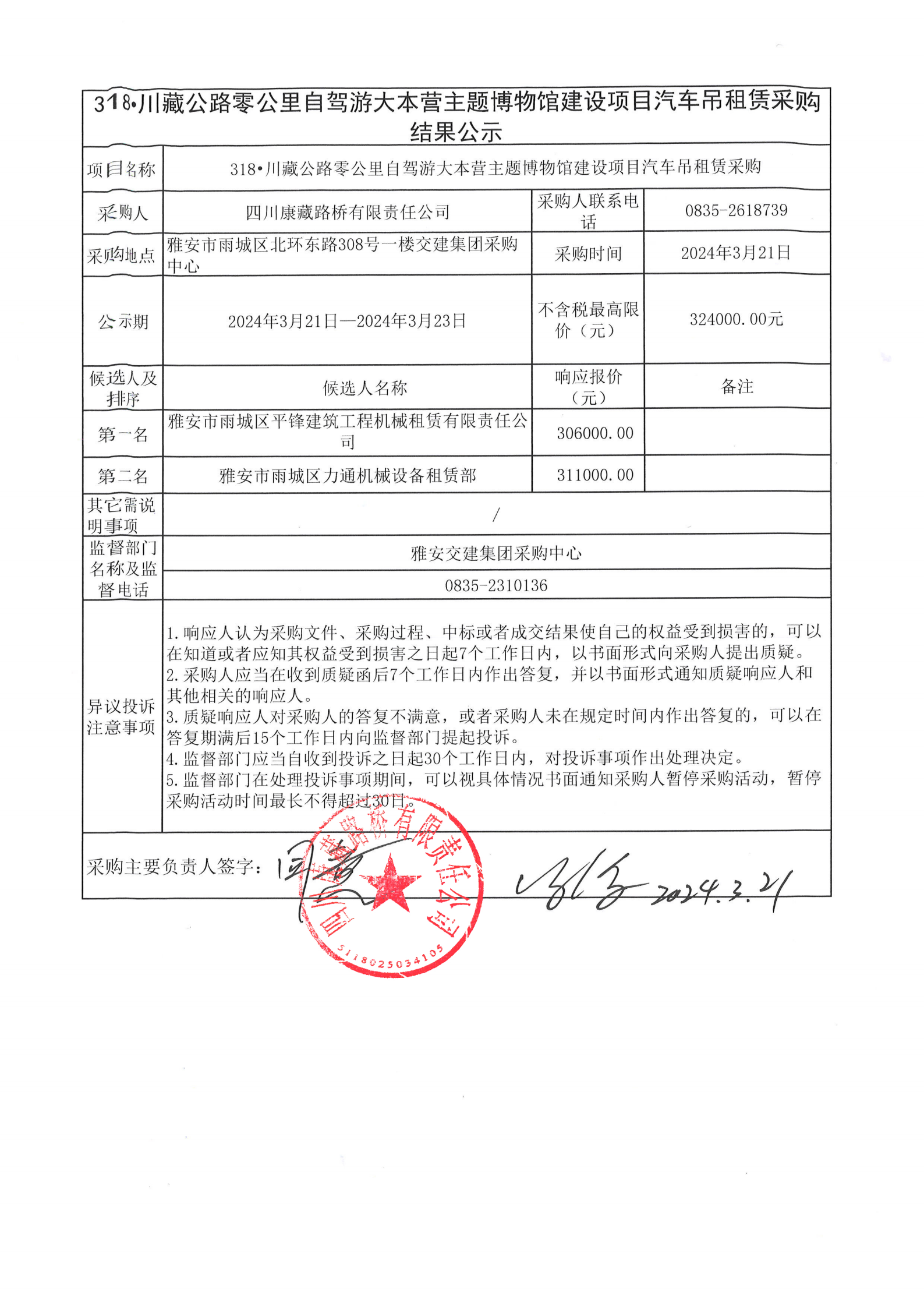 四川康藏路橋有限責任公司318·川藏公路零公里自駕游大本營主題博物館建設(shè)項目汽車吊租賃采購結(jié)果公示