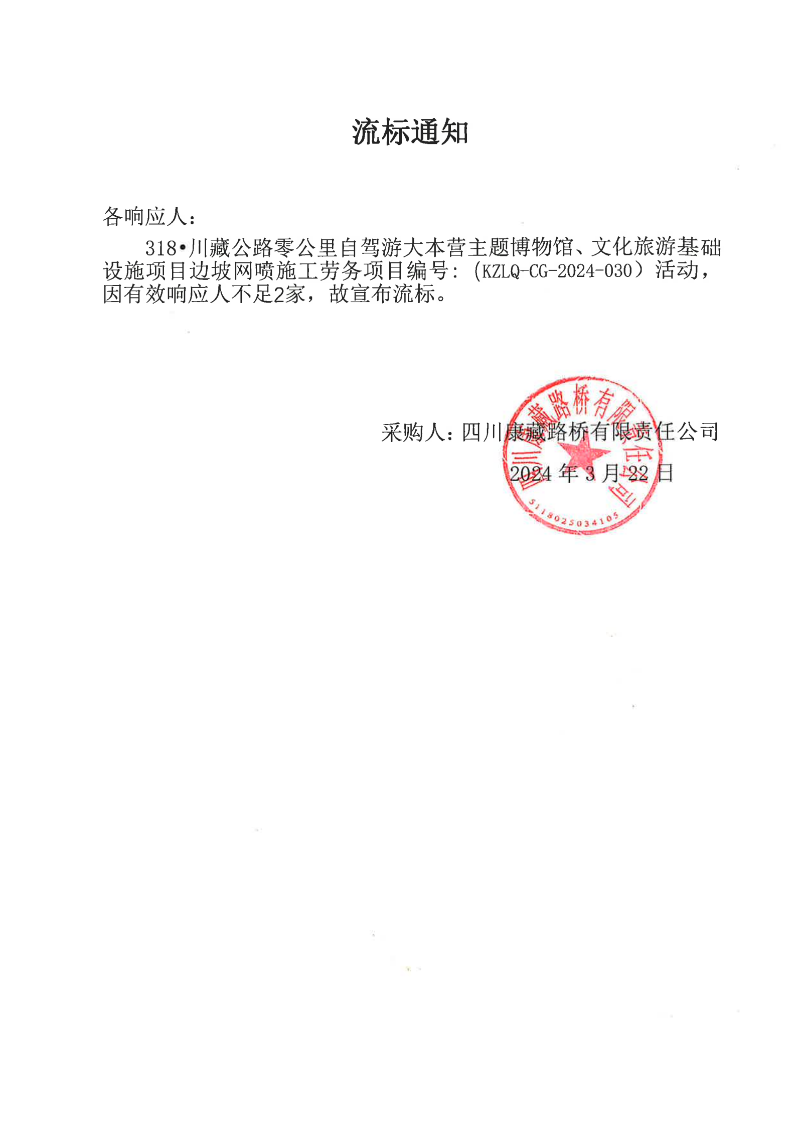 四川康藏路橋有限責(zé)任公司318·川藏公路零公里自駕游大本營(yíng)主題博物館、文化旅游基礎(chǔ)設(shè)施項(xiàng)目邊坡網(wǎng)噴施工勞務(wù)流標(biāo)通知