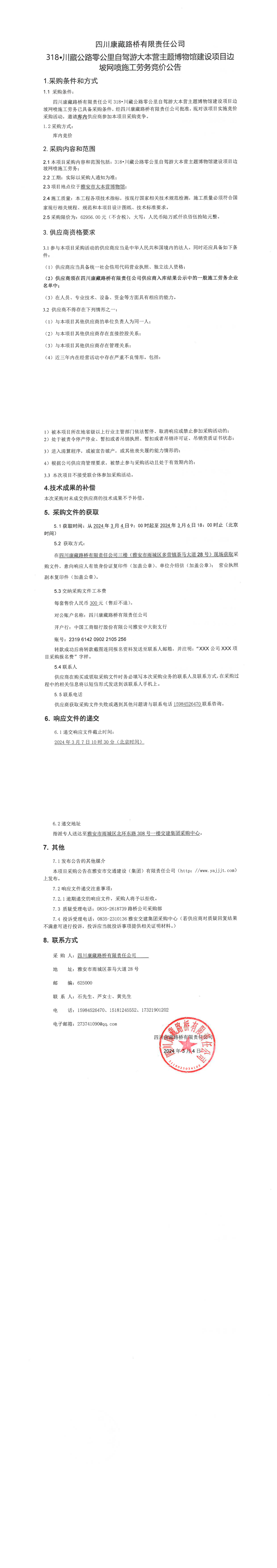四川康藏路橋有限責(zé)任公司318·川藏公路零公里自駕游大本營(yíng)主題博物館建設(shè)項(xiàng)目邊坡網(wǎng)噴施工勞務(wù)競(jìng)價(jià)公告