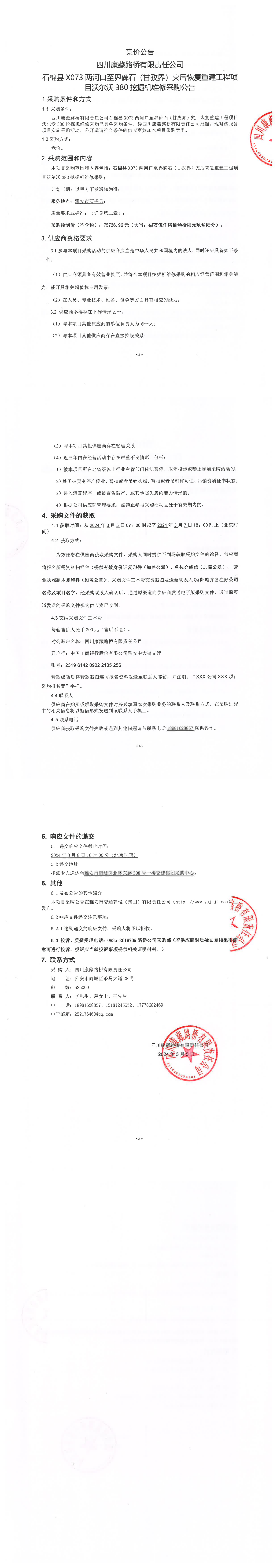 四川康藏路橋有限責(zé)任公司石棉縣X073兩河口至界碑石(甘孜界)災(zāi)后恢復(fù)重建工程項(xiàng)目沃爾沃380挖掘機(jī)維修采購公告