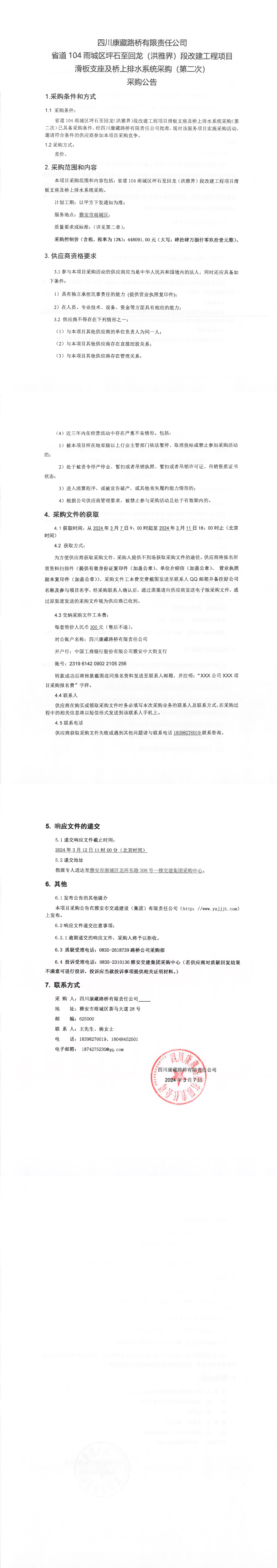 四川康藏路橋有限責(zé)任公司省道104雨城區(qū)坪石至回龍(洪雅界)段改建工程項(xiàng)目滑板支座及橋上排水系統(tǒng)流采購標(biāo)通知