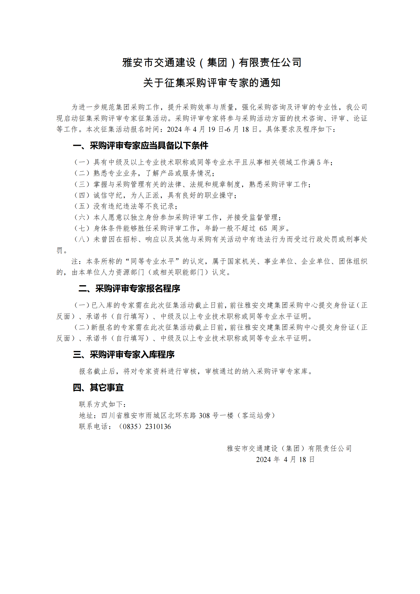 雅安市交通建設(shè)(集團)有限責任公司關(guān)于征集采購評審專家的通知