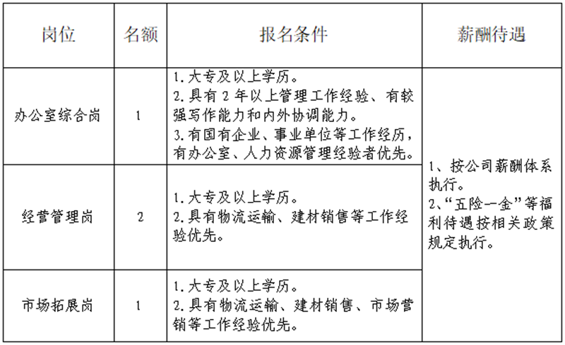 雅安交建集團運通貿(mào)易有限公司是雅安市交通建設(shè)(集團)有限責(zé)任公司下屬子公司。主要從事普通貨運、建材銷售、供應(yīng)鏈管理、貨運代理、貨運信息咨詢服務(wù)、倉儲配送服務(wù)等工作。現(xiàn)根據(jù)公司業(yè)務(wù)發(fā)展需要,決定招聘4名工作人員,現(xiàn)將有關(guān)事項公告如下: