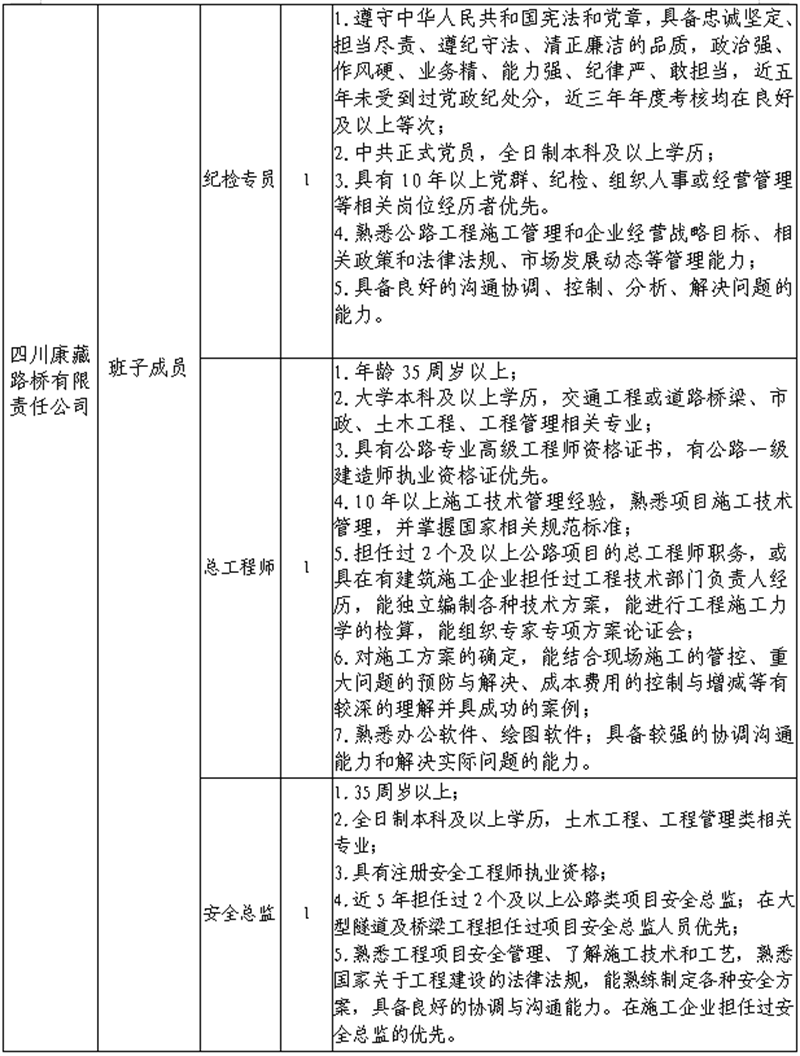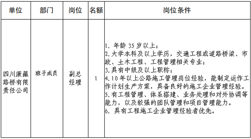 根據發(fā)展需要,決定面向社會公開招聘雅安市交通建設(集團)有限責任公司(以下簡稱“雅安交建集團”)所屬子公司班子成員4名,現(xiàn)將有關事項公告如下: