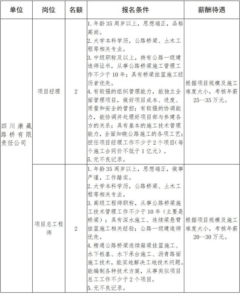 根據(jù)發(fā)展需要,決定面向社會公開招聘雅安市交通建設(shè)(集團(tuán))有限責(zé)任公司(以下簡稱“雅安交建集團(tuán)”)所屬子公司工程項目主要負(fù)責(zé)人10名,現(xiàn)將有關(guān)事項公告如下: