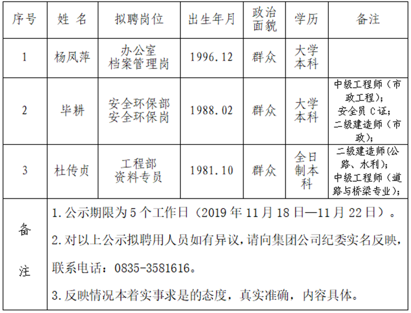 通過公開報名、資格審查、面試等程序,經雅安交建集團資產經營管理有限公司研究擇優(yōu)確定以下