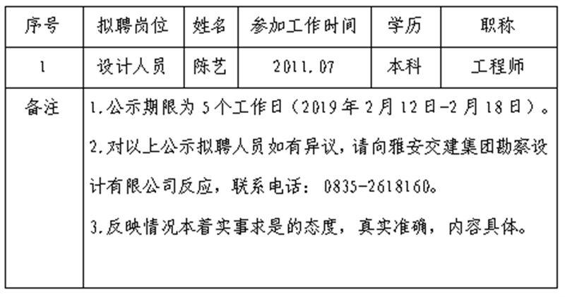 雅安交建集團勘察設計有限公司擬聘用人員公示