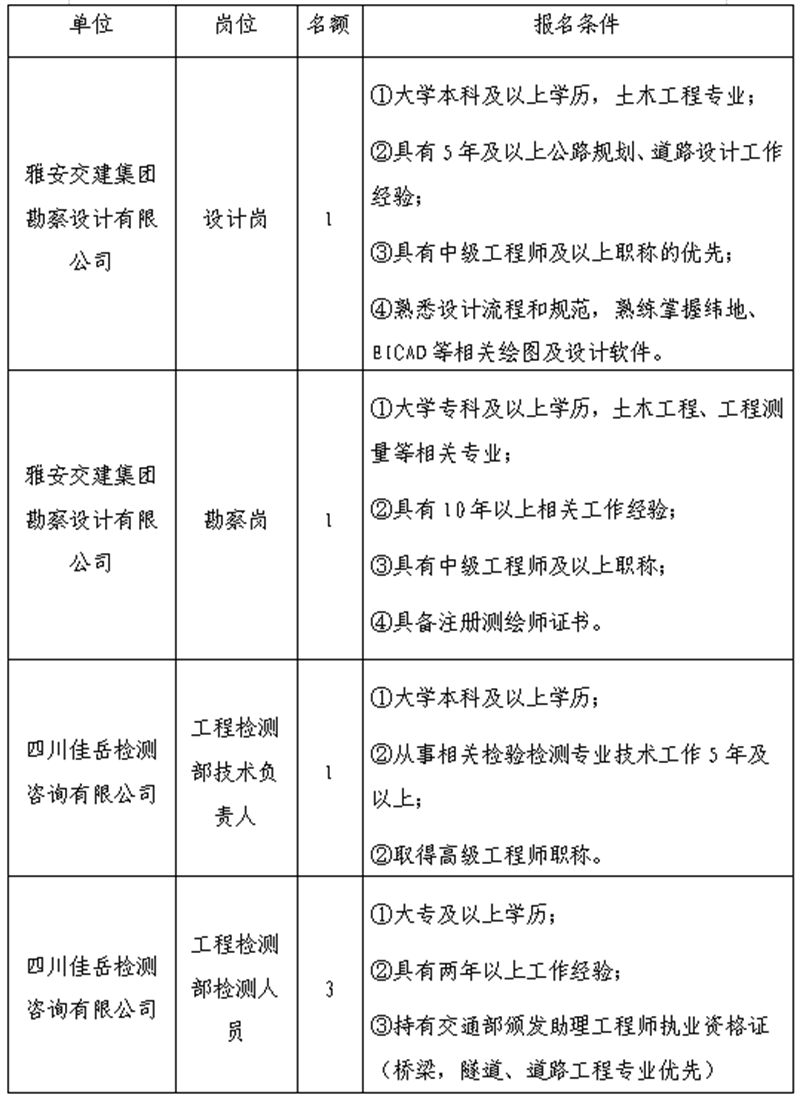 根據(jù)發(fā)展需要,決定面向社會(huì)公開(kāi)招聘雅安市交通建設(shè)(集團(tuán))有限責(zé)任公司(以下簡(jiǎn)稱“雅安交建集團(tuán)”)所屬子公司工作人員6名,現(xiàn)將有關(guān)事項(xiàng)公告如下:
