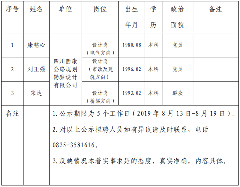雅安交建集團子公司擬聘用人員公示(勘察設計公司)