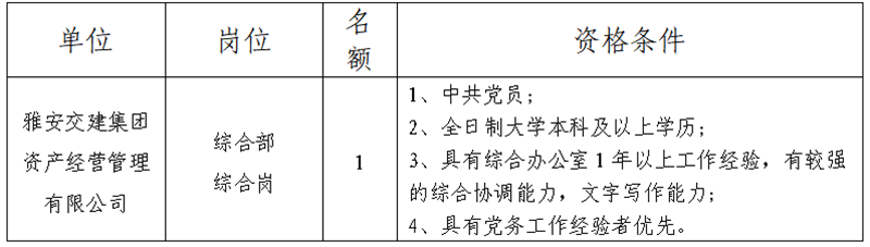 根據發(fā)展需要,決定面向社會公開招聘雅安市交通建設(集團)有限責任公司(以下簡稱“雅安交建集團”)所屬子一般工作人員1名,現(xiàn)將有關事項公告如下: