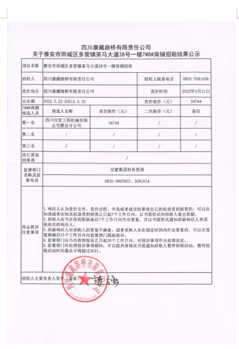 四川康藏路橋有限責任公司關(guān)于雅安市雨城區(qū)多營鎮(zhèn)茶馬大道28號一樓7#8#商鋪招租結(jié)果公示