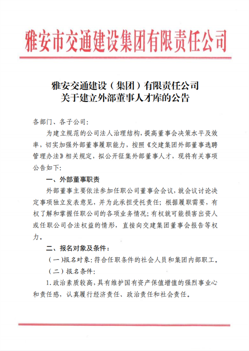 雅安交通建設(集團)有限責任公司 關于建立外部董事人才庫的公告