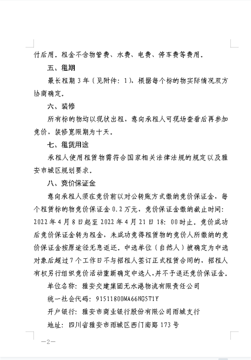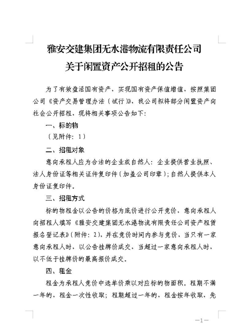 雅安交建集團(tuán)無水港物流有限責(zé)任公司關(guān)于資產(chǎn)掛網(wǎng)招租的公告