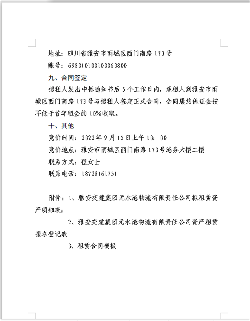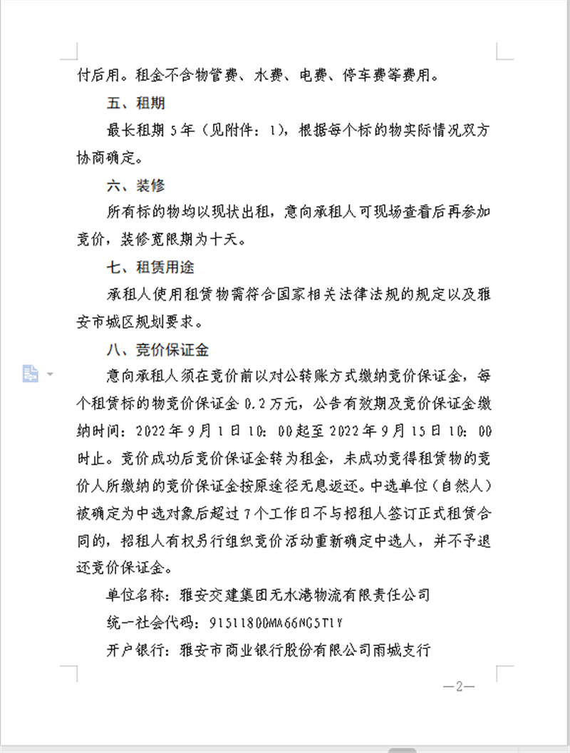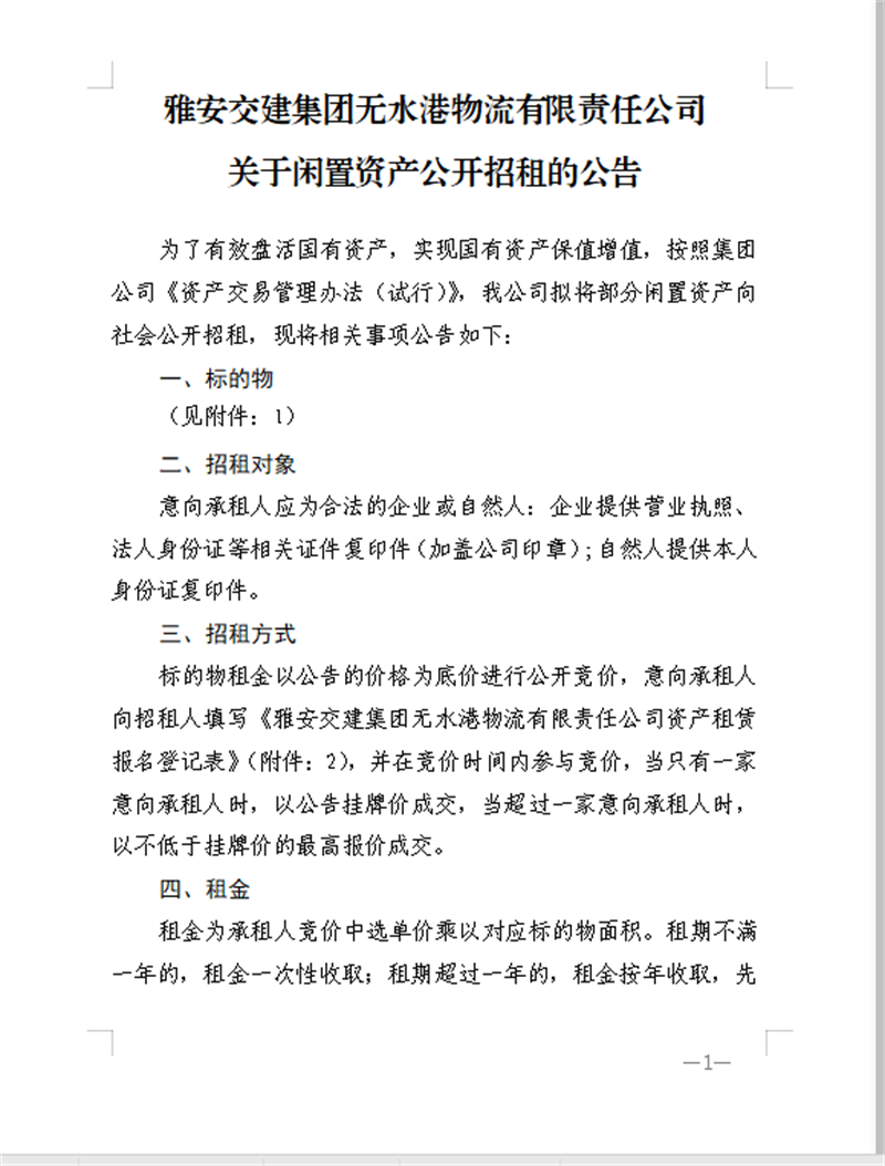 雅安交建無水港公司關于閑置資產(chǎn)公開招租的公告