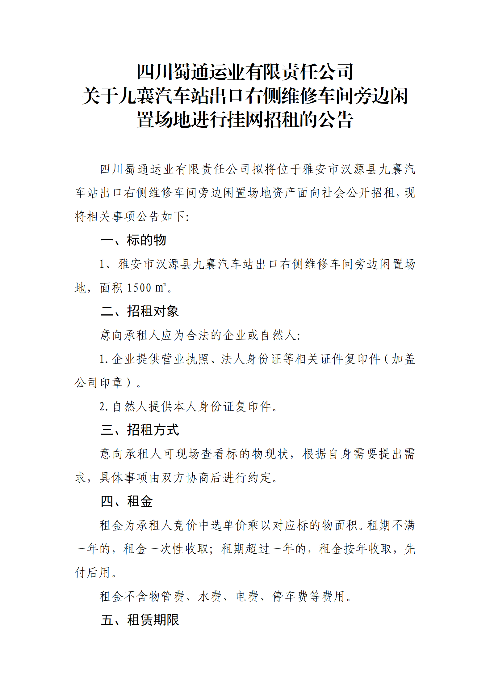 四川蜀通運(yùn)業(yè)有限責(zé)任公司 關(guān)于九襄汽車站出口右側(cè)維修車間旁邊閑置場地進(jìn)行掛網(wǎng)招租的公告