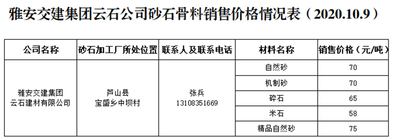 雅安交建集團(tuán)云石公司砂石骨料銷售價(jià)格情況表(2020.10.9)