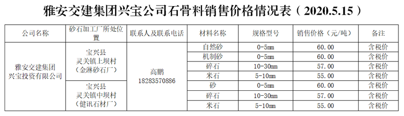雅安交建集團(tuán)興寶公司砂石骨料銷售價(jià)格情況表(2020.5.15)