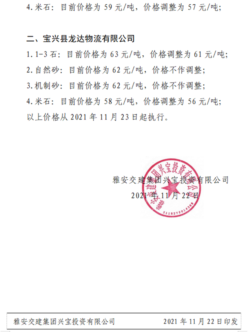 雅安交建集團興寶公司關(guān)于調(diào)整成品料銷售價格的通知(2021.11.23)
