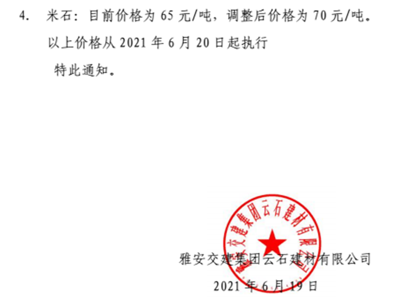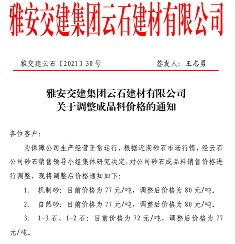 雅安交建集團(tuán)云石公司砂石骨料銷(xiāo)售價(jià)格情況表(2021.6.20)