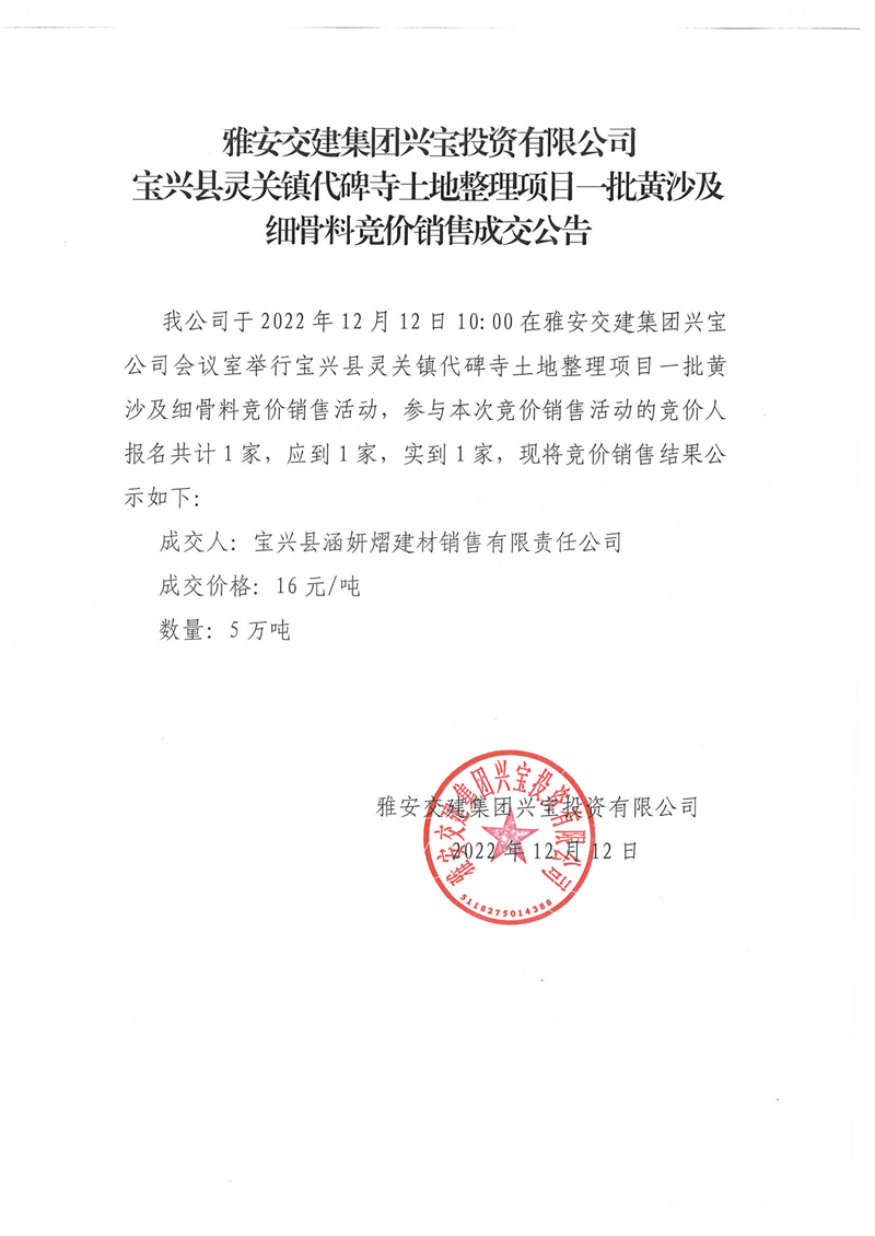 雅安交建集團(tuán)興寶投資有限公司寶興縣靈關(guān)鎮(zhèn)代碑寺土地整理項(xiàng)目5萬噸黃沙及細(xì)骨料競價銷售成交公告(2022-12-12)