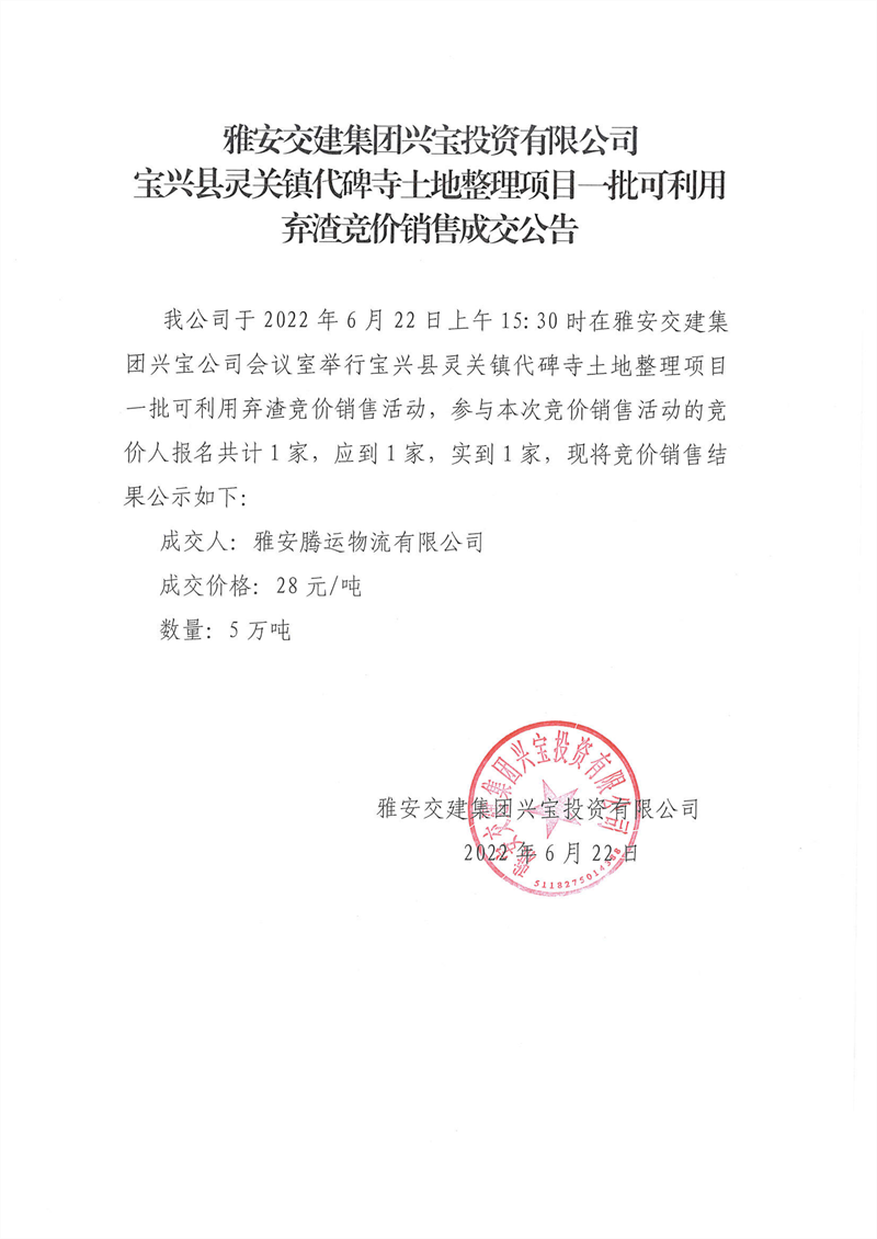 雅安交建集團興寶投資有限公司 關于調(diào)整砂石成品料銷售價格的通知(2022-6-22)
