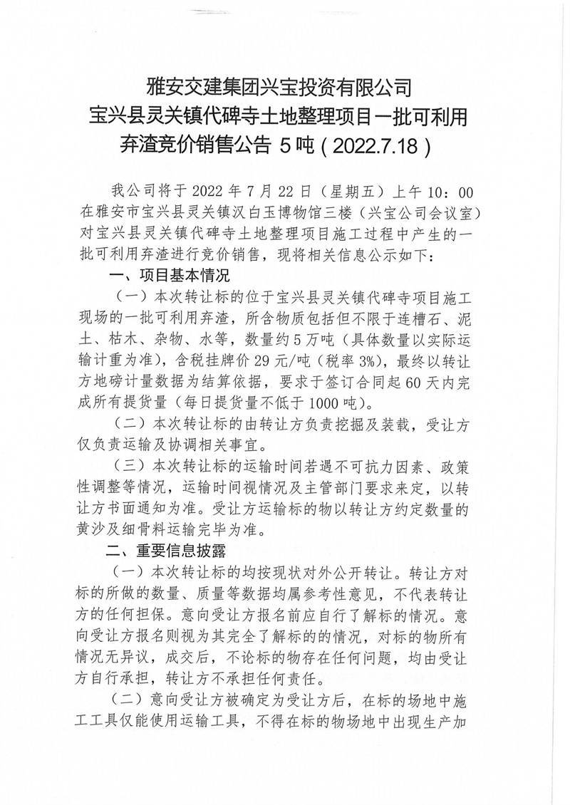 寶興縣靈關(guān)鎮(zhèn)代碑寺土地整理項(xiàng)目一批可利用棄渣競價銷售公告7.18(5萬噸)