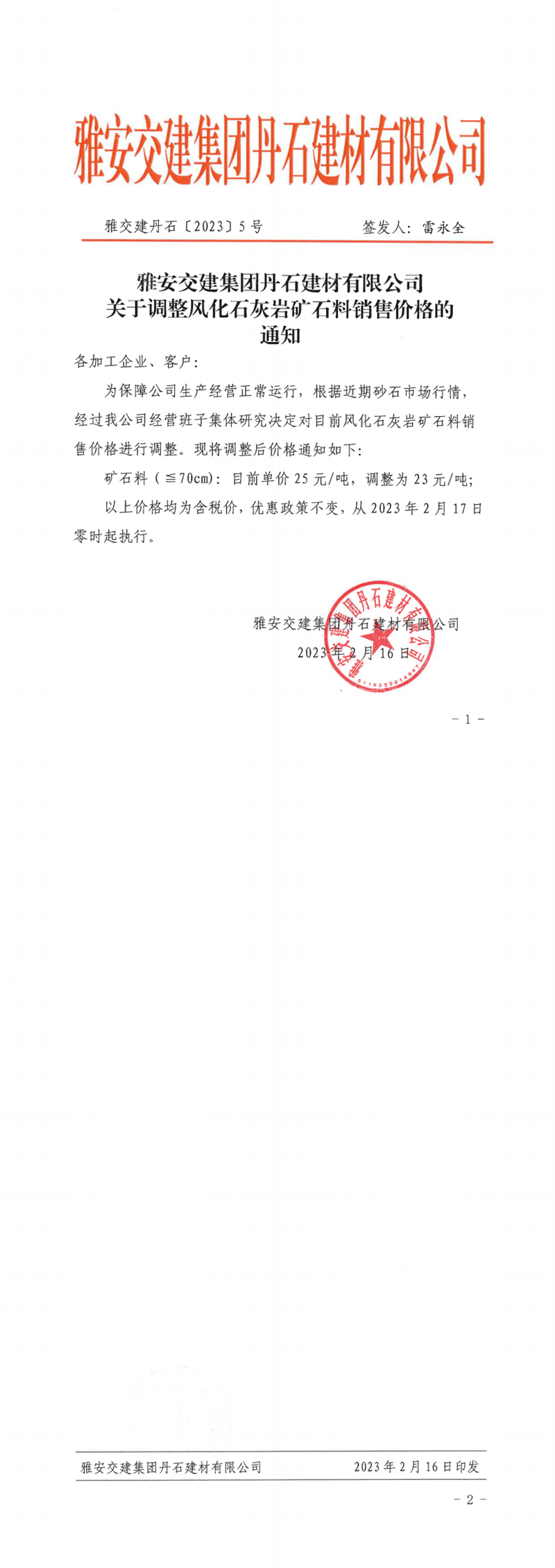 雅交建丹石(2023)5號調整風化石灰?guī)r礦料銷售價格的通知(2023.02.16)