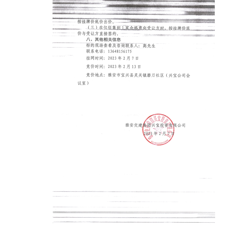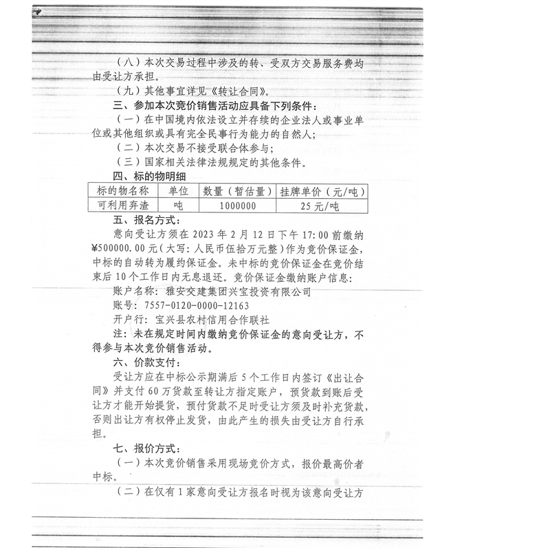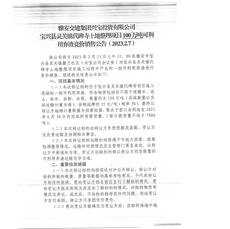 雅安交建集團(tuán)興寶投資有限公司100萬噸可利用棄渣競價銷售流標(biāo)公告(2023.2.13)
