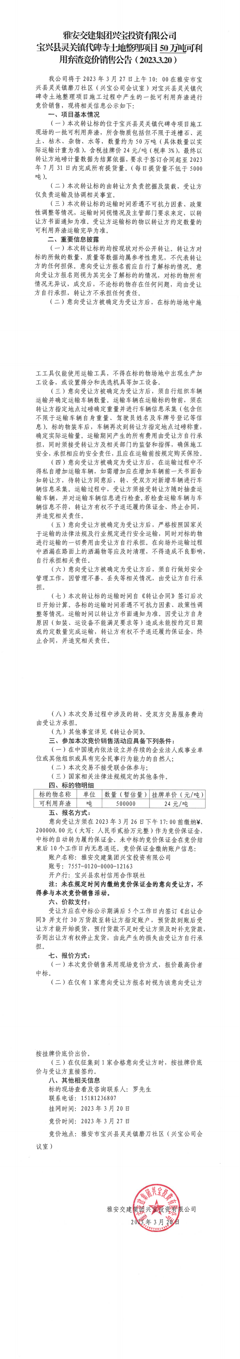 雅安交建集團興寶投資有限公司靈關鎮(zhèn)代碑寺土地整理項目30萬噸可利用棄渣競價銷售成交公告(2023.3.20)
